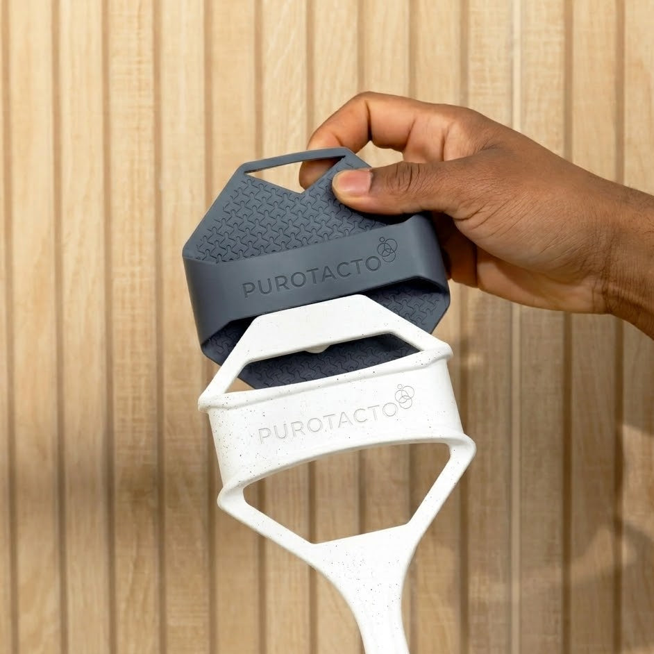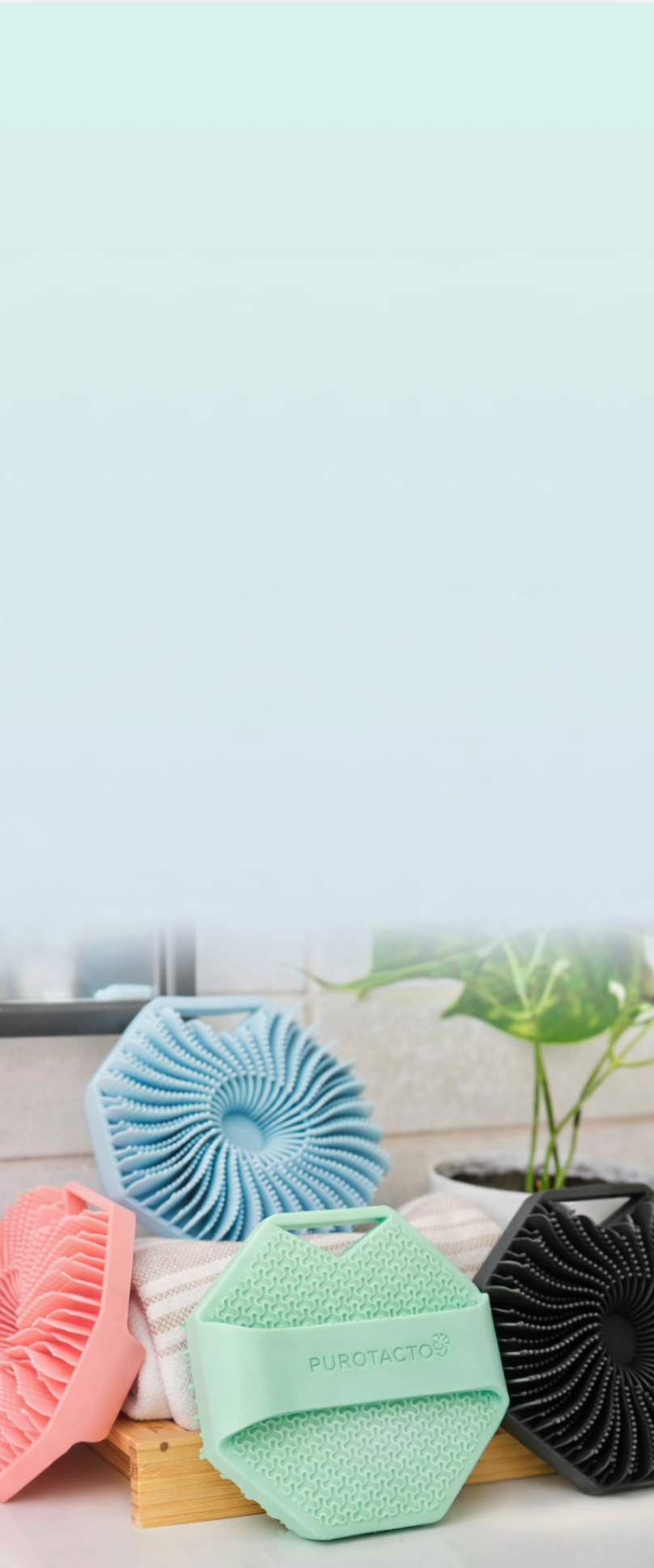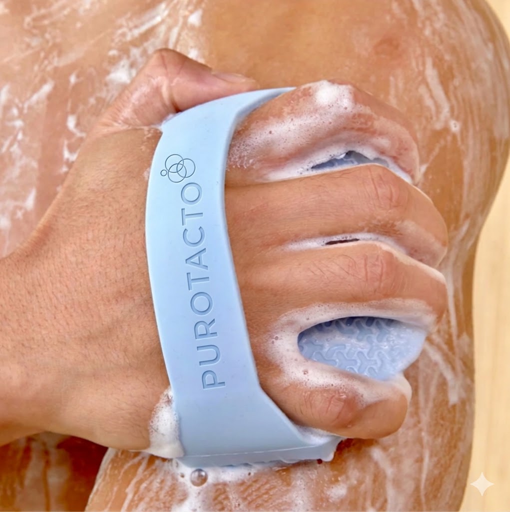 La silicona no es inherentemente antimicrobiana. Purotacto está fabricado con silicona de grado alimenticio, a la que se le añade plata y zinc durante el proceso de fabricación para ayudar a prevenir el crecimiento de bacterias y hongos en el propio exfoliante*. Sus exclusivas aletas exfoliantes son más suaves para la piel y proporcionan un masaje relajante sin igual.